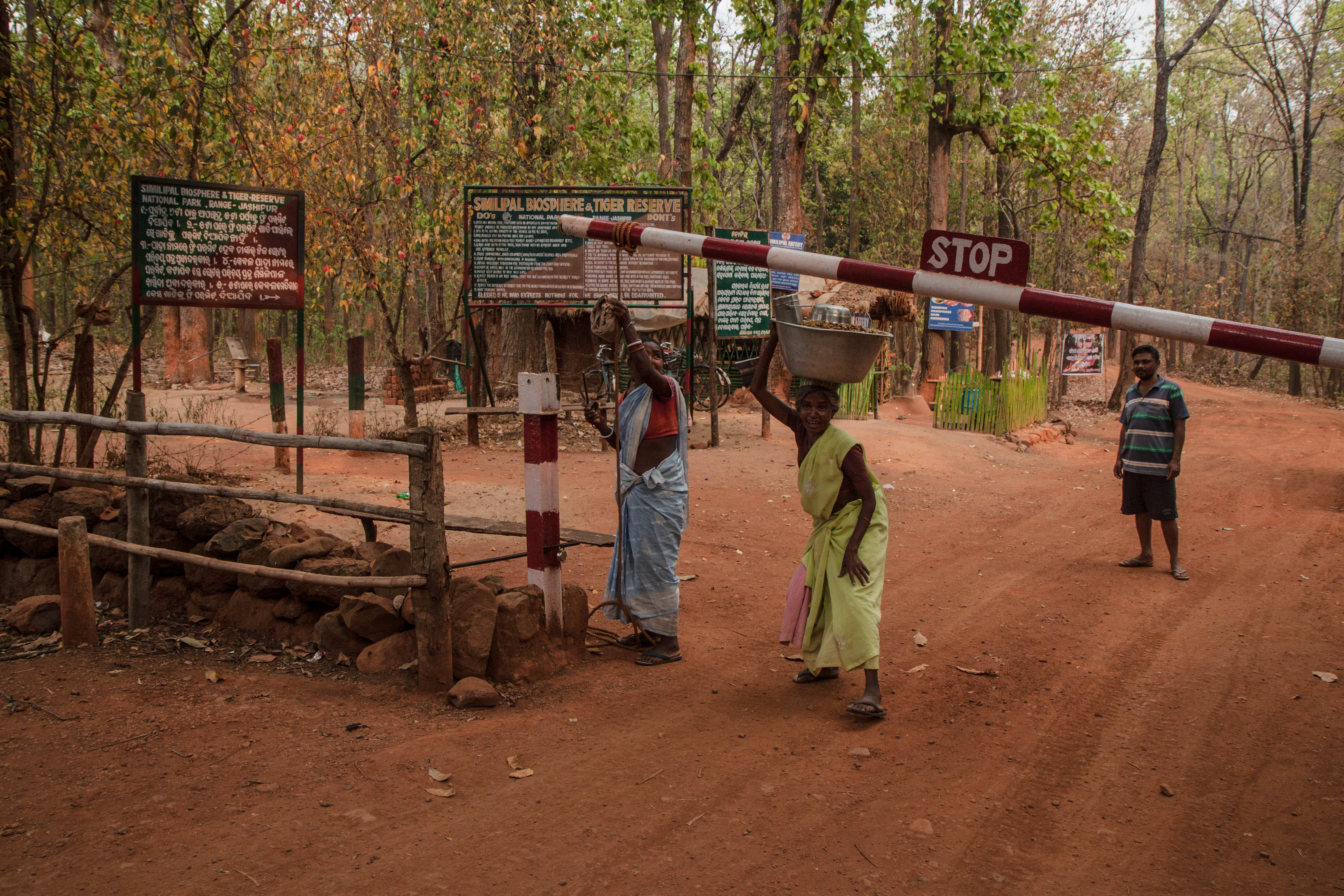 - Women leaving the gate of the entry of Simipal Tiger Reserve in Odisha, after the collection of mahua flowers.